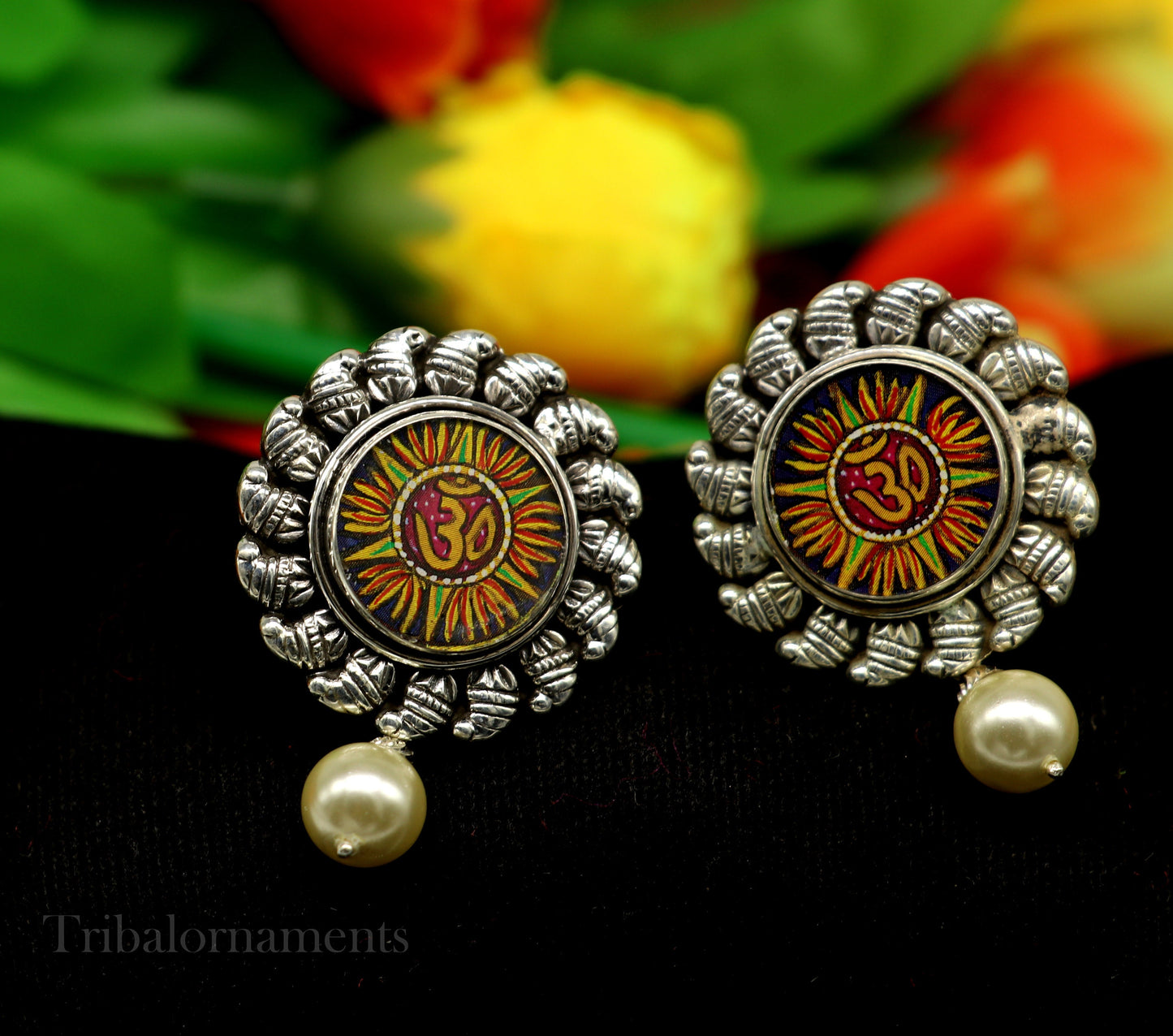Divine Mantra Aum Om Stud Earring Hand Painted Miniature Art Photo Glass Framed 92 5 Sterling Silver Ethnic Earring Stylish Jewelry Ear939 Tribal Ornaments