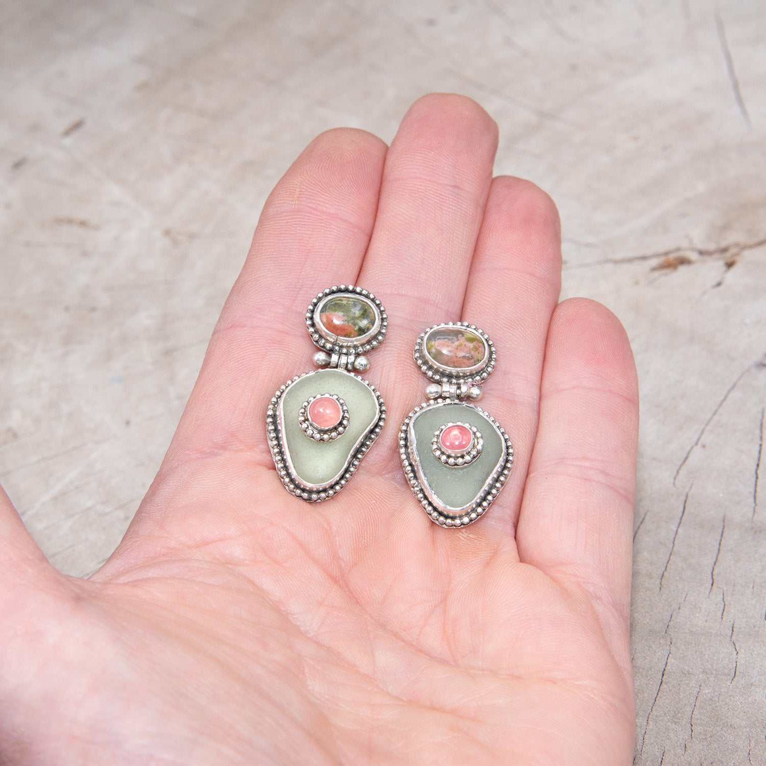 Sea Glass And Stone Earrings In Hand Crafted Settings Of Sterling Silv Cozy Cove Studio